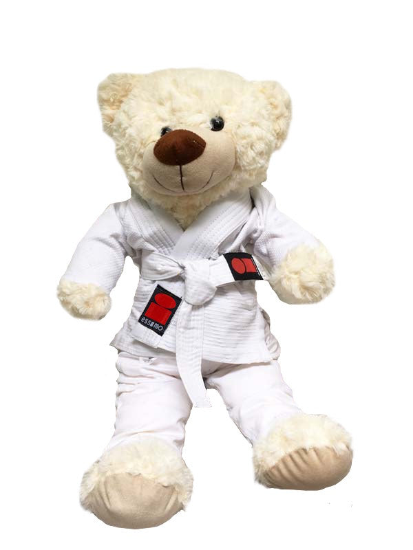 Mooie, pluche beer met een judopakje (Essimo) aan, schattiger kan het bijna niet.