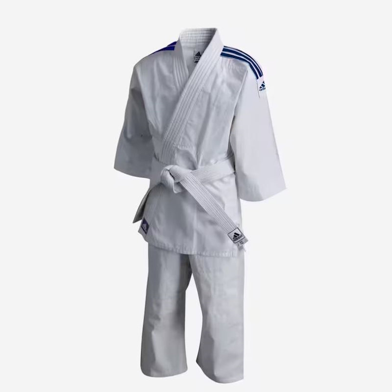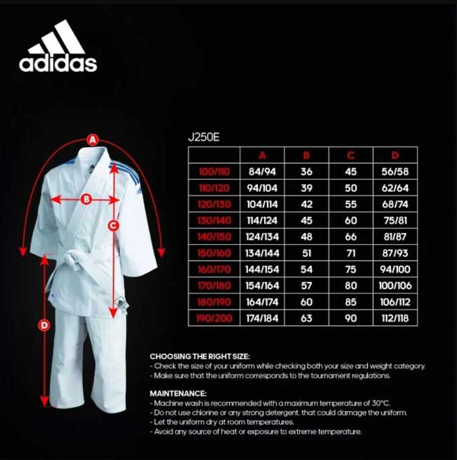 Zo voordelig is dit kinderjudopak. Je koopt het in de huidige maat en word die te klein dan haal je een paar steekjes los in de mouwen en/of broekspijpen en het judopak is een maat groter. Verder is deze Adidas-judogi lekker stevig, licht en soepel en voert het vocht snel af. Dankzij de combinatie van katoen en polyester. Die er ook voor zorgt dat dit judopak van Adidas minder krimpt. Meegroei-judopak J250 heeft een zwaardere kwaliteit dan model J200E .