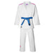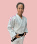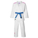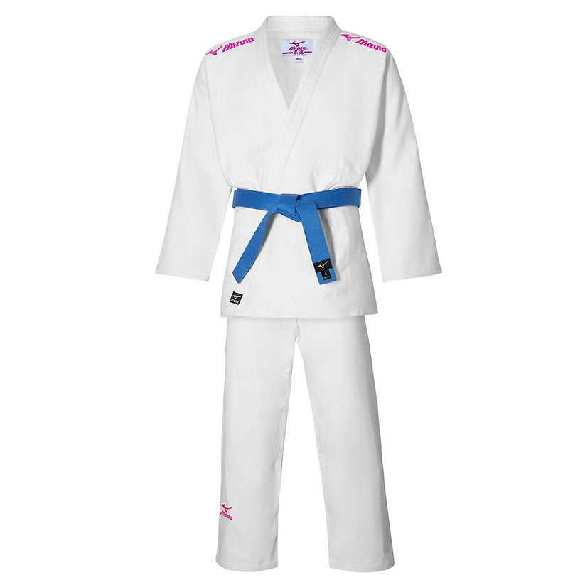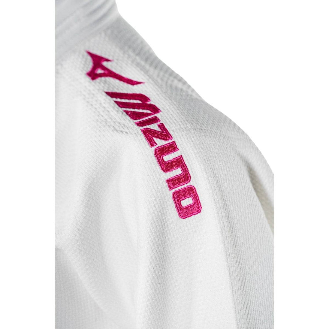 Eigenschappen van de jas: Rijstkorrel Geborduurd Roze Mizuno-logo op de linkermouw Roze label Mizuno-logo aan de onderkant van de jas Wit binnen etiket met roze Mizuno-logo Verstevigingsnaad rug Kraag- en onderarmverstevigingen Driehoekige versteviging onderaan de jas, Materiaal: Polyester 20% Katoen 80% 650 gram