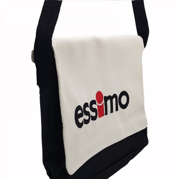 Die Essimo-Umhängetasche verfügt über eine abnehmbare Klappe aus dickem, hochwertigem weißem Judostoff mit dem gestickten Essimo-Logo. Dies verleiht der Tasche eine persönliche Note und zeigt, dass Sie stolz auf die Marke Essimo sind. Durch den Klettverschluss lässt sich die Klappe einfach anbringen und abnehmen.