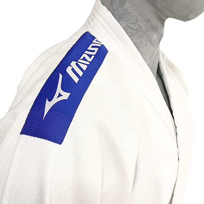 - Blue shoulder labels with Mizuno logo on both shoulders.